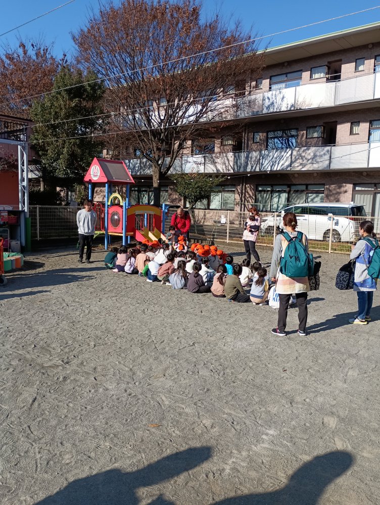 本日も、予告無しでの避難訓練を行いました。放送後に、「お・か・し・も」を守りながら園庭にスムーズに集合ができました。その後、各クラスで散歩にいきましたが、園外保育中の避難訓練として、地震発生、不審者発見とクラスごとで内容を変え、園外避難訓練を実施し、戻ってきました。