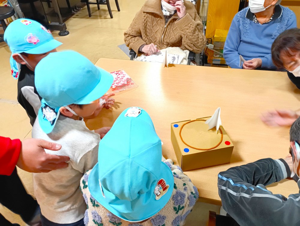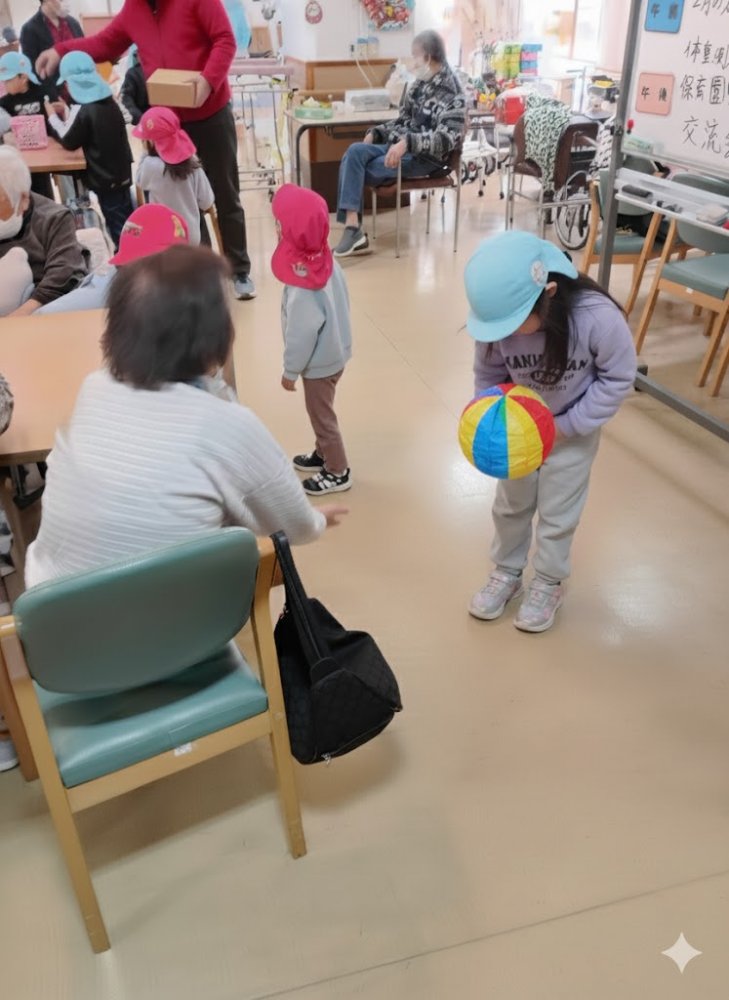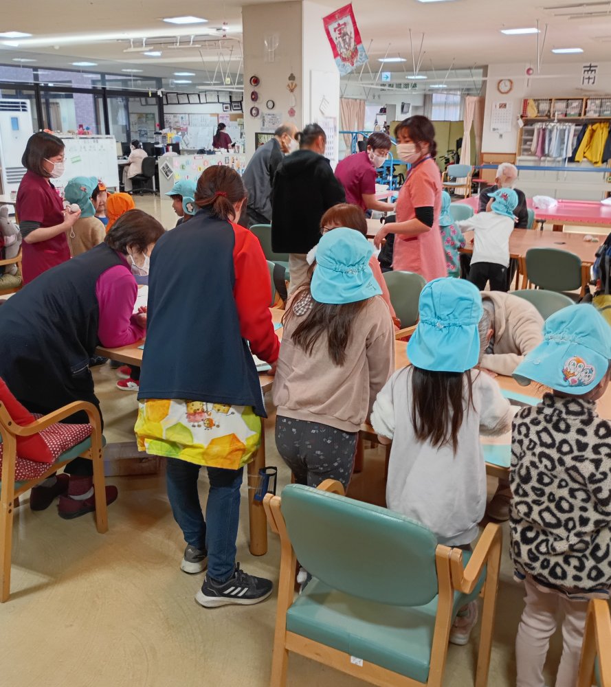 昨日よりも人数が多く、デイの方で、けん玉や紙風船等も準備していただき、ご高齢の方々と幼児クラス全員楽しく過ごせました。