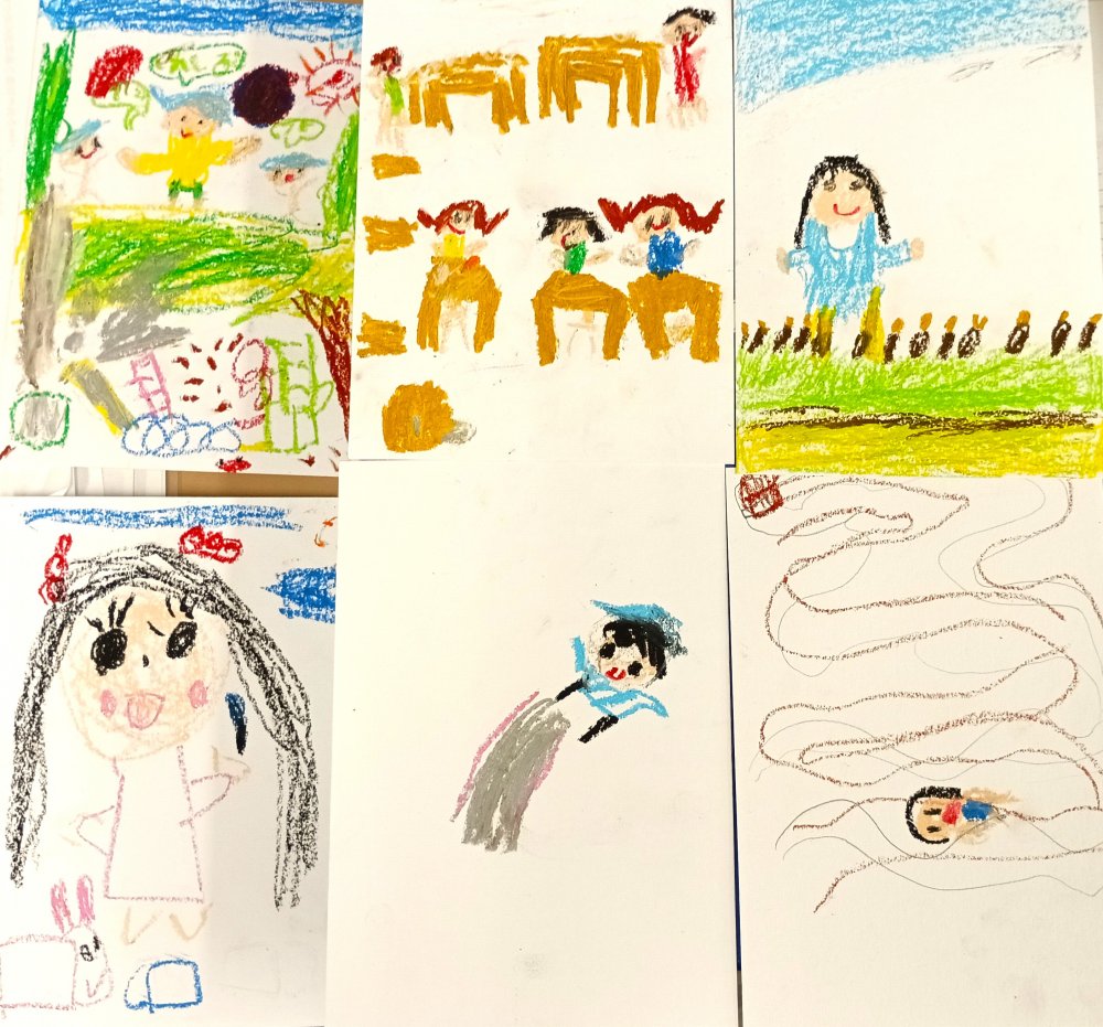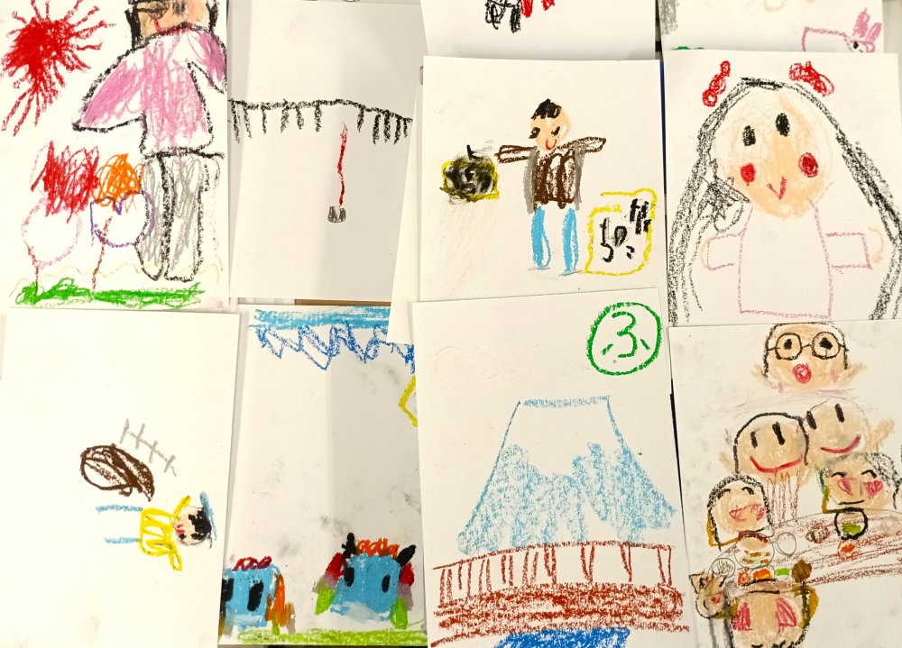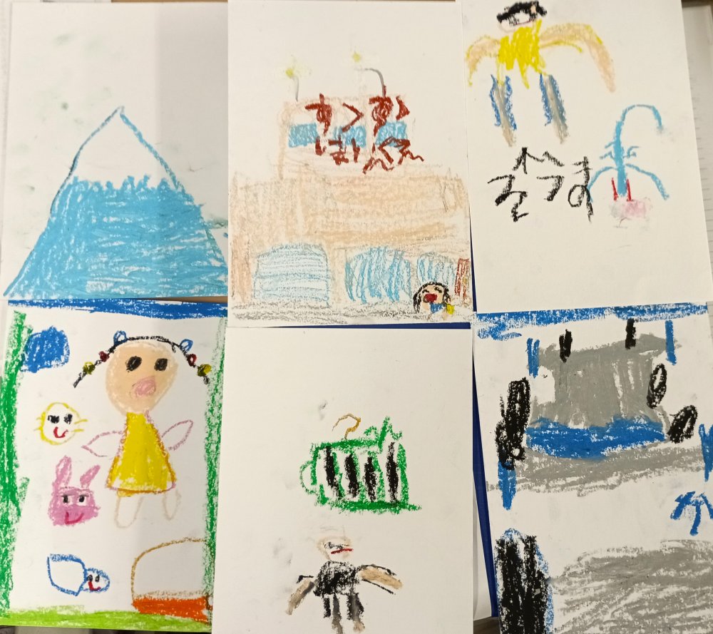 クレヨンで絵や文字を書き、読み札もひらがなで作成しました。