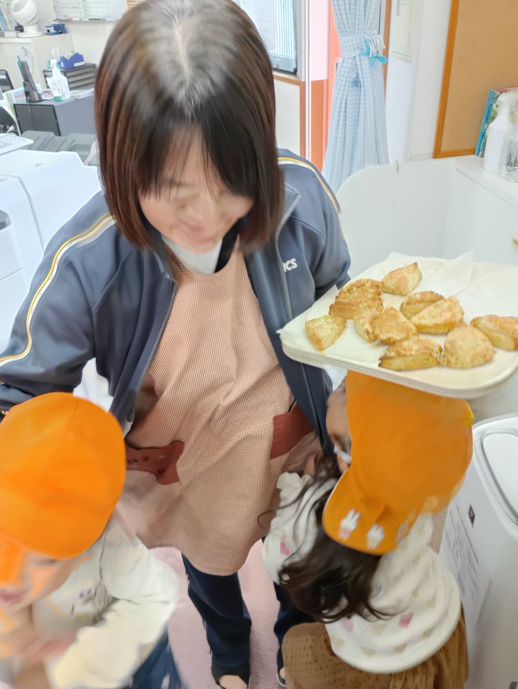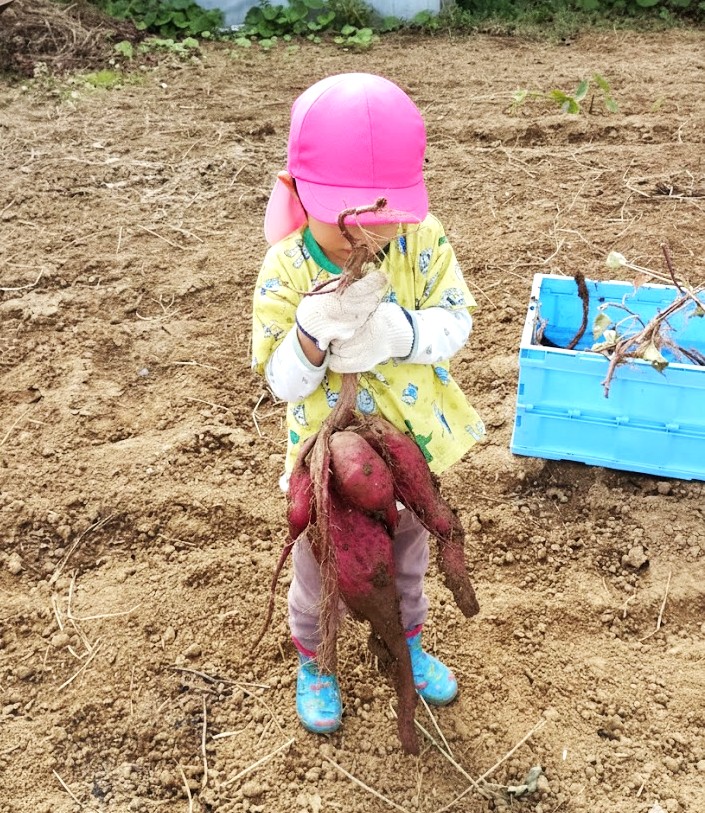 今年度は豊作で沢山採れました。「おおきなカブ」のお話のように大きなさつま芋があり、みんなの力で掘り起こしたりと楽しいハプニングで盛り上がりました。是非、ご家庭で、お芋掘りの様子を聞いてみてください。