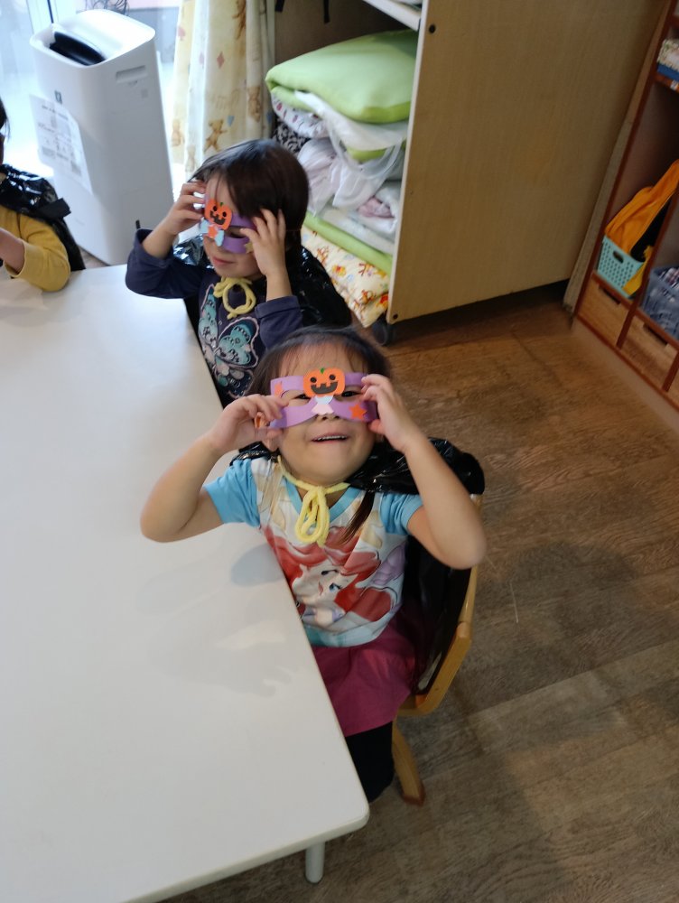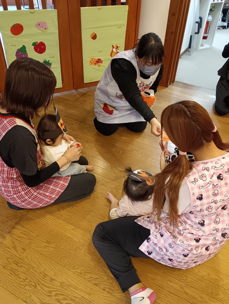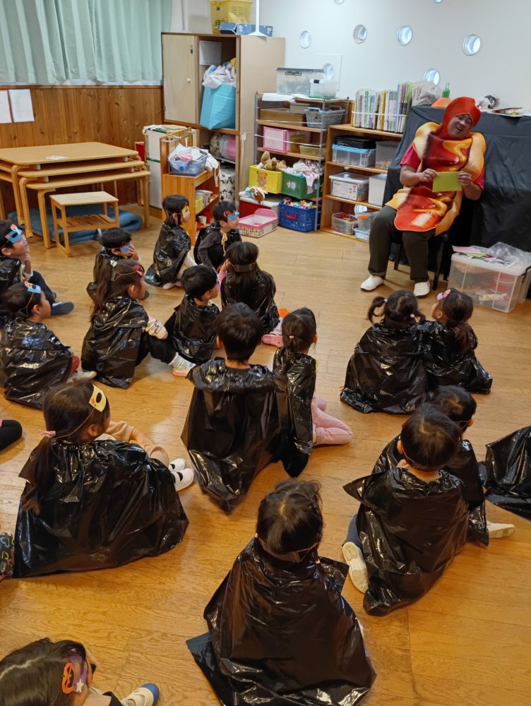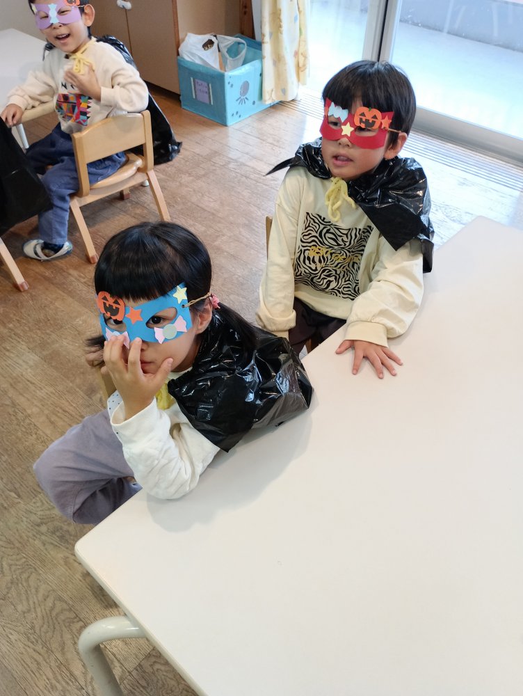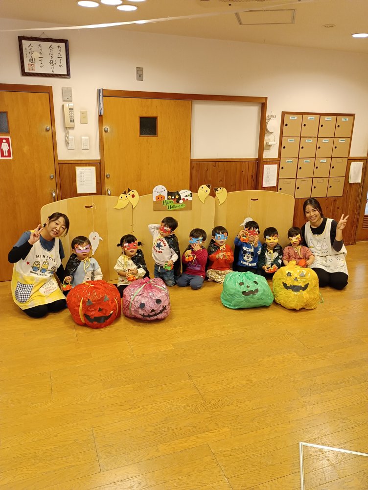 本日は、ハロウィン。乳児クラスは、ホールにフォトスポットを作り、記念撮影と、カボチャの制作品をプレゼントしました。また、幼児クラスは、黒マントとマスクを装い、ホットドックマンと先生たちで、姉妹法人の都筑ハートフルステーション、おひさま病児保育室と、お買い物でお世話になっている吉田屋さんを回り、「トリックオアトリート お菓子をくれないといたずらしちゃうよ」とみんなで大人達に声をかけてくれました。
