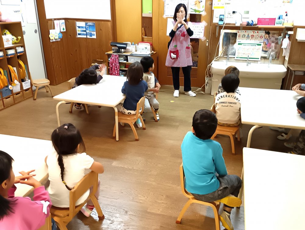 本日は、各クラスで活動しました。1・3歳クラスは、絵本読み聞かせの「りぷりんと」さんがご本を読み聞かせをして下さり、2歳クラスは、リズム遊び、4歳クラスは、園の看護師より、手洗い指導を行いました。