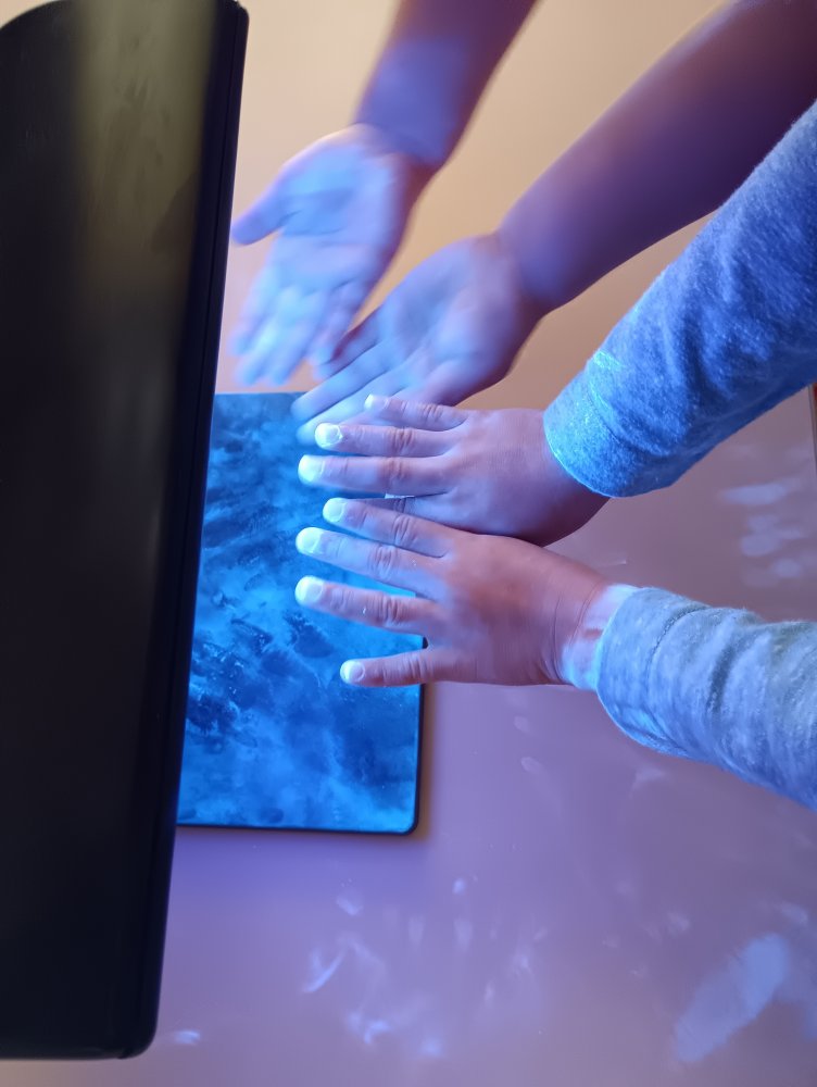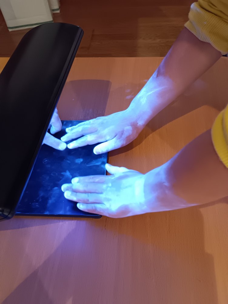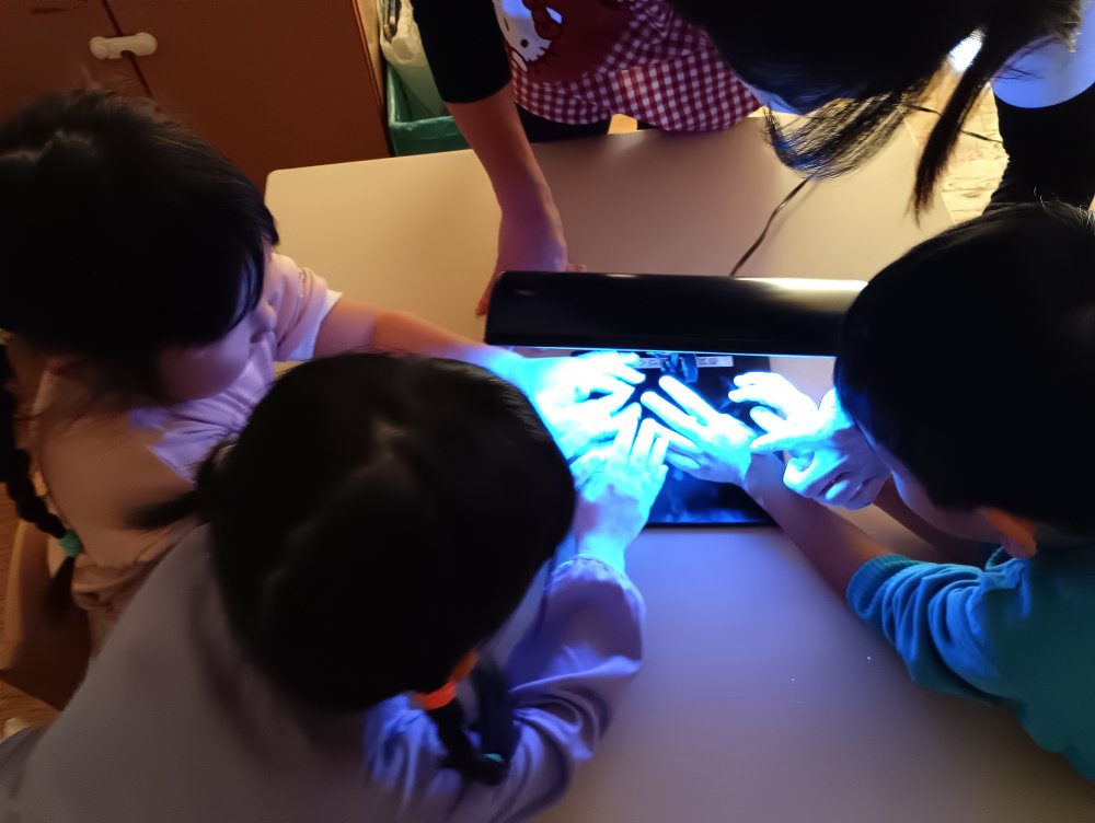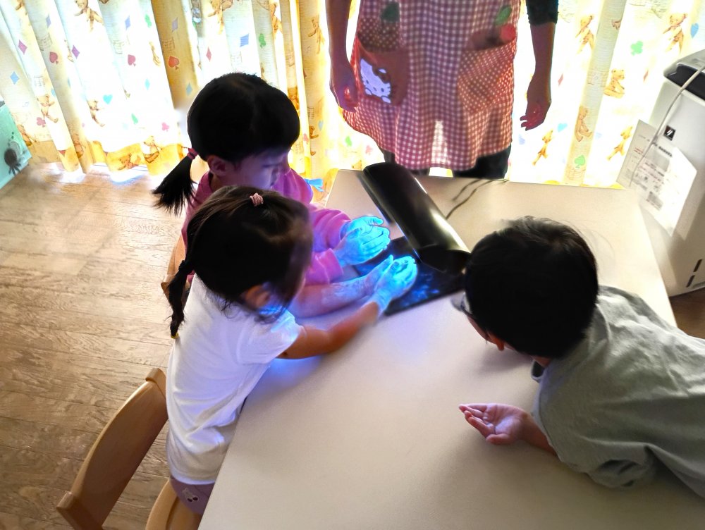 本日は、年長さんの手洗い指導を行いました。さすが年長さん。手洗い方法やブラックライトでの洗い残しがしやすい所も理解しながら実践していました。