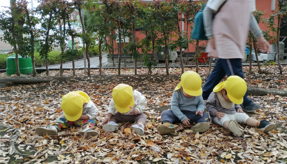 乳児クラスの先生から「かわいい写真がとれそう」とのことでスマホを届けに行きました。落ち葉の上に一列に座って落ち葉と戯れる姿はかわいいですね