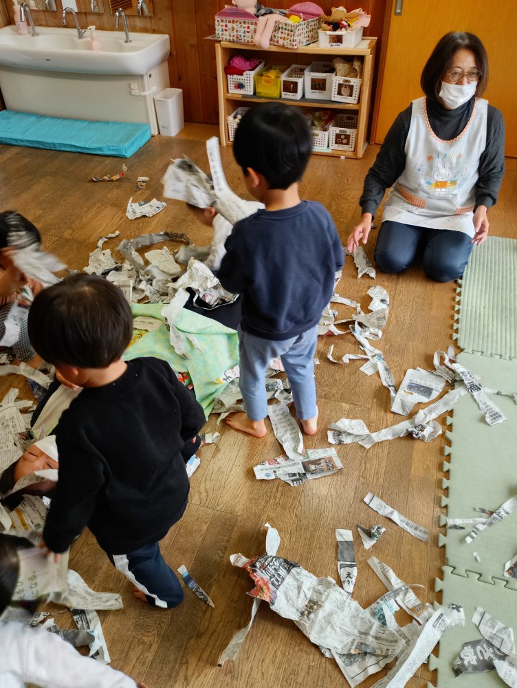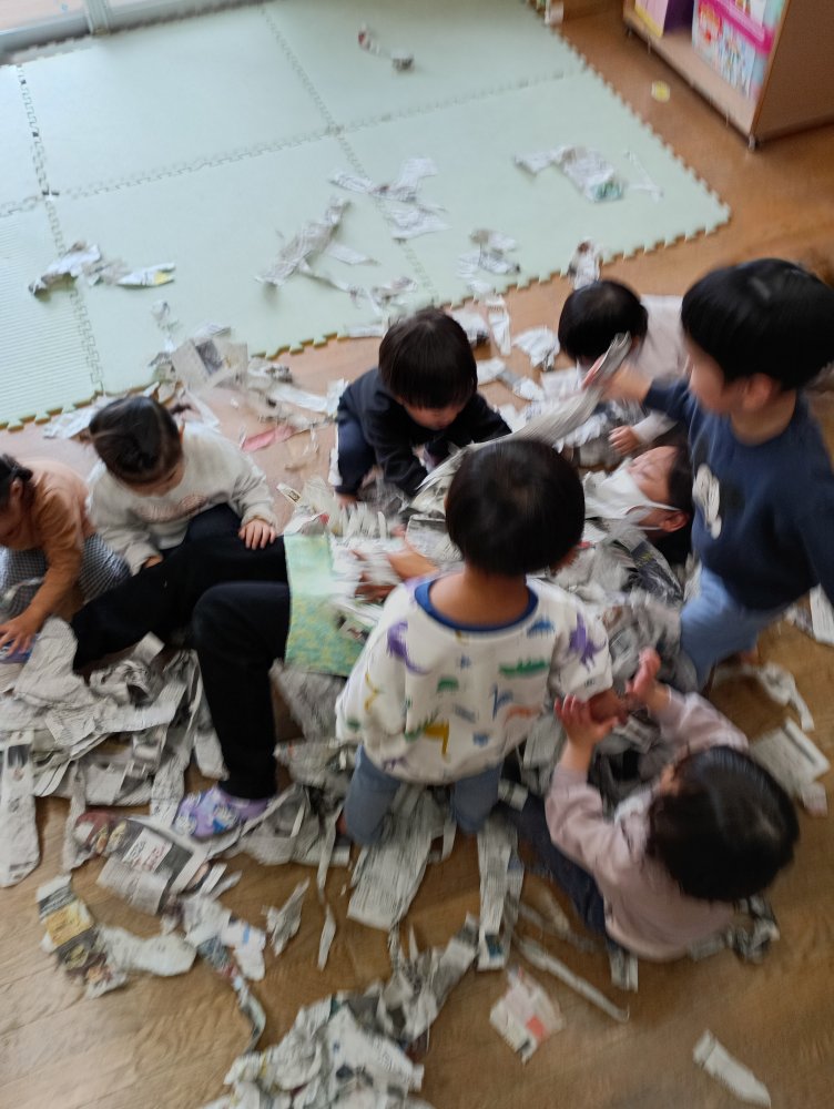 ホールから、楽しそうな声が聞こえたので、お部屋を覗いてみたら、新聞紙をちぎって遊んでいました。担任が「寒いから足元もかけてくださーい」と新聞紙を担任の全身にかけたあと、むくっと起き上がり、新聞紙が舞うと大はしゃぎ。中には、新聞紙でほうきのように作ったもので、おもちゃ箱を掃いて大掃除?をしてくれました。