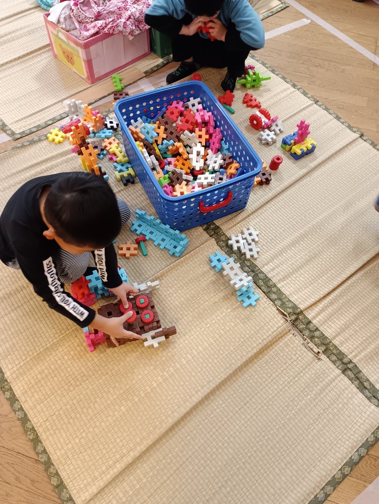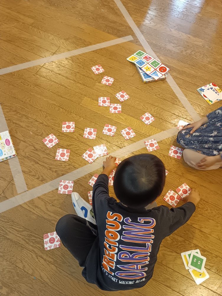 2階ホールも賑やかだったので、覗きにいくと、ホールでは、中型ブロックで、一生懸命に作っています。声をかけてると「見て見て」と嬉しそうに作ったものを友だち同士で見せ合って笑っていました。隣りでは、カード遊びを真剣にやっていました。年長さんクラスでは、女の子チームが担任を囲いながら女子トークしていました。