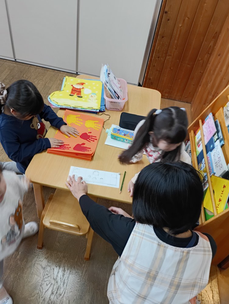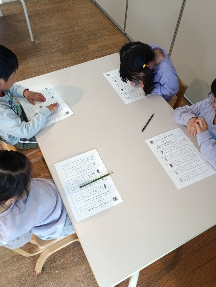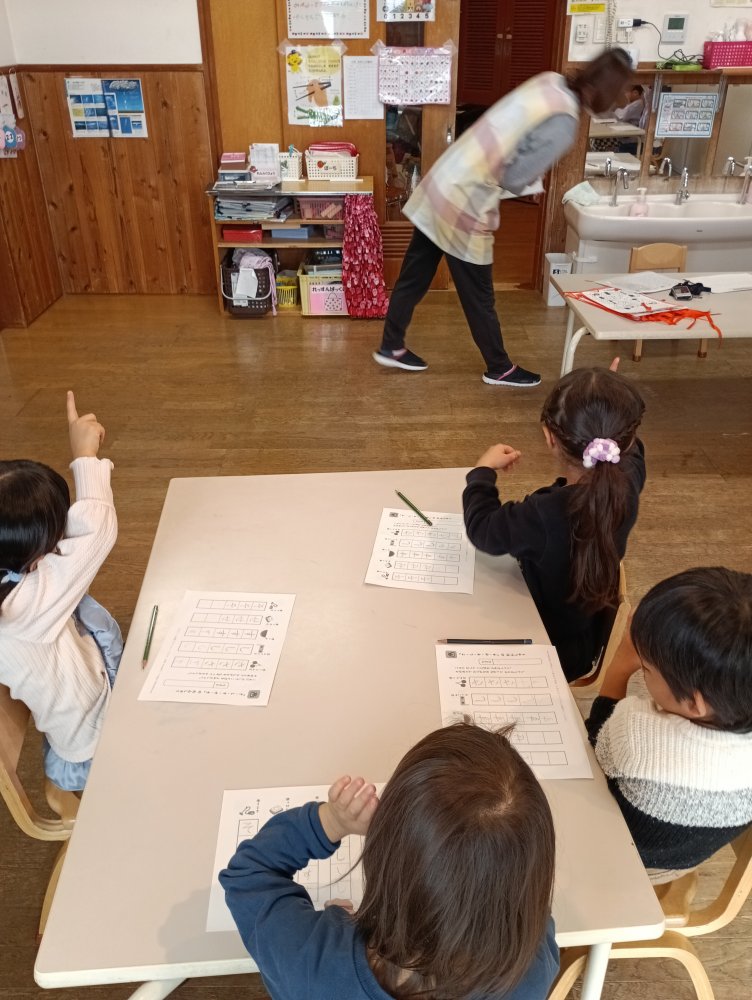 年中クラスさんは、ひらがなの練習をしていました。一文字ごとに、何の言葉なのか、先生がお手本を見せながら練習したりと、一生懸命取り組んでいました。