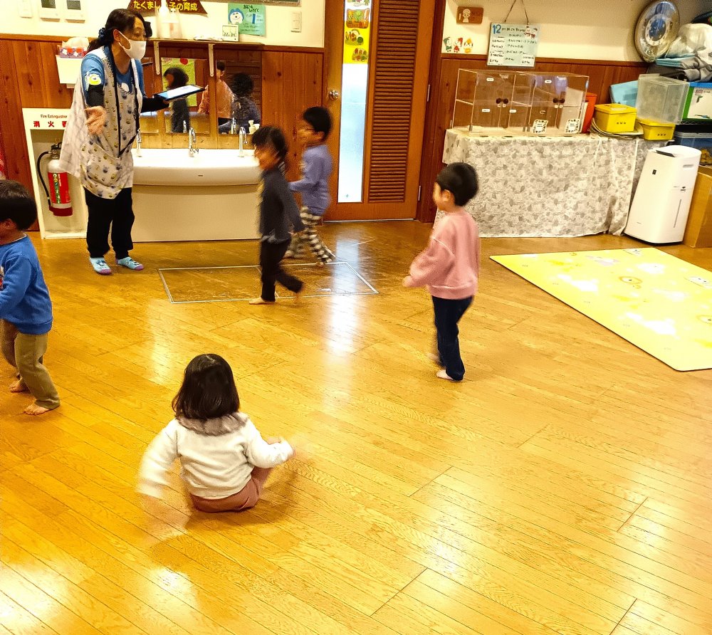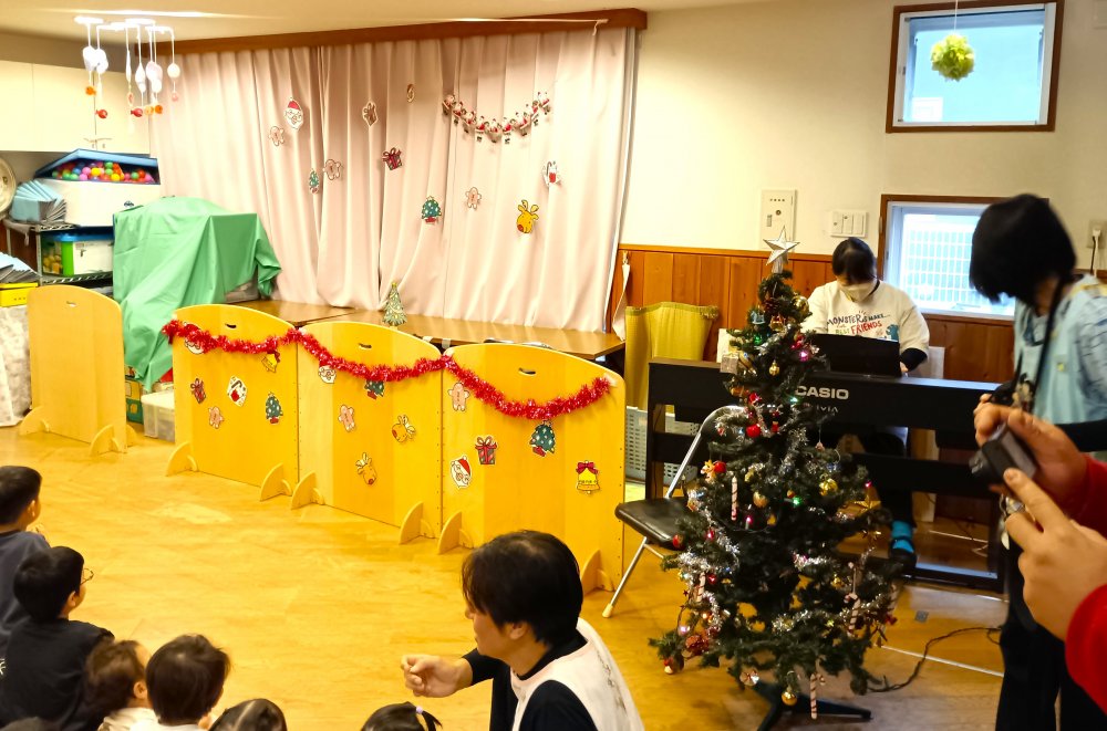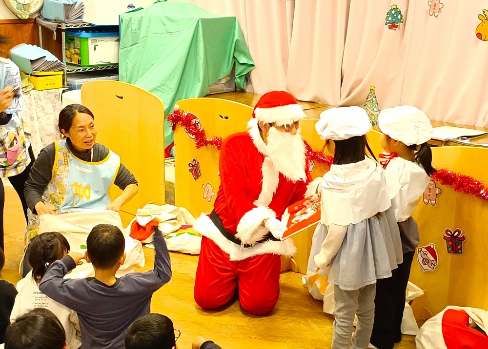 クリスマスソングを歌い、どこから出てくるのかドキドキ、ワクワクしながらサンタさん登場。サンタさんに「マイクラのゲームは好きですか?」、「好きな食べ物は何ですか?」、「好きな色は何ですか?」の質問に答えてくれました。赤色が好きで、ポストのような形が好きなようです。全員にプレゼントももらえ、サンタさんは、次のお仕事があるため、帰られました。ご自宅で沢山のプレゼントで遊んで頂けたら嬉しいです。