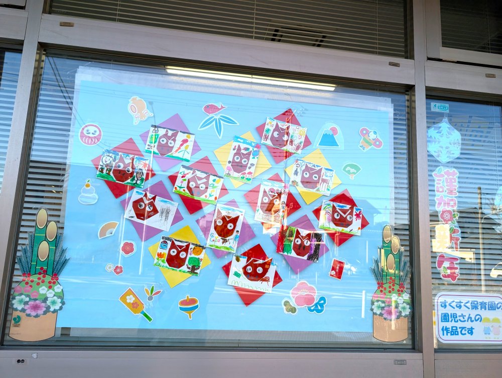 大棚郵便局の正面窓に、ぶどうさんの作品を飾って頂きました。 写真は☞ こちら |