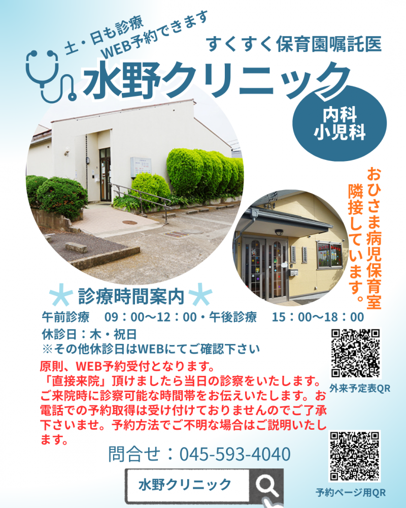 当法人の経営者兼嘱託医の水野クリニックが昨年度、園内に掲示と同様ですが、WEB予約へ変更となっております。